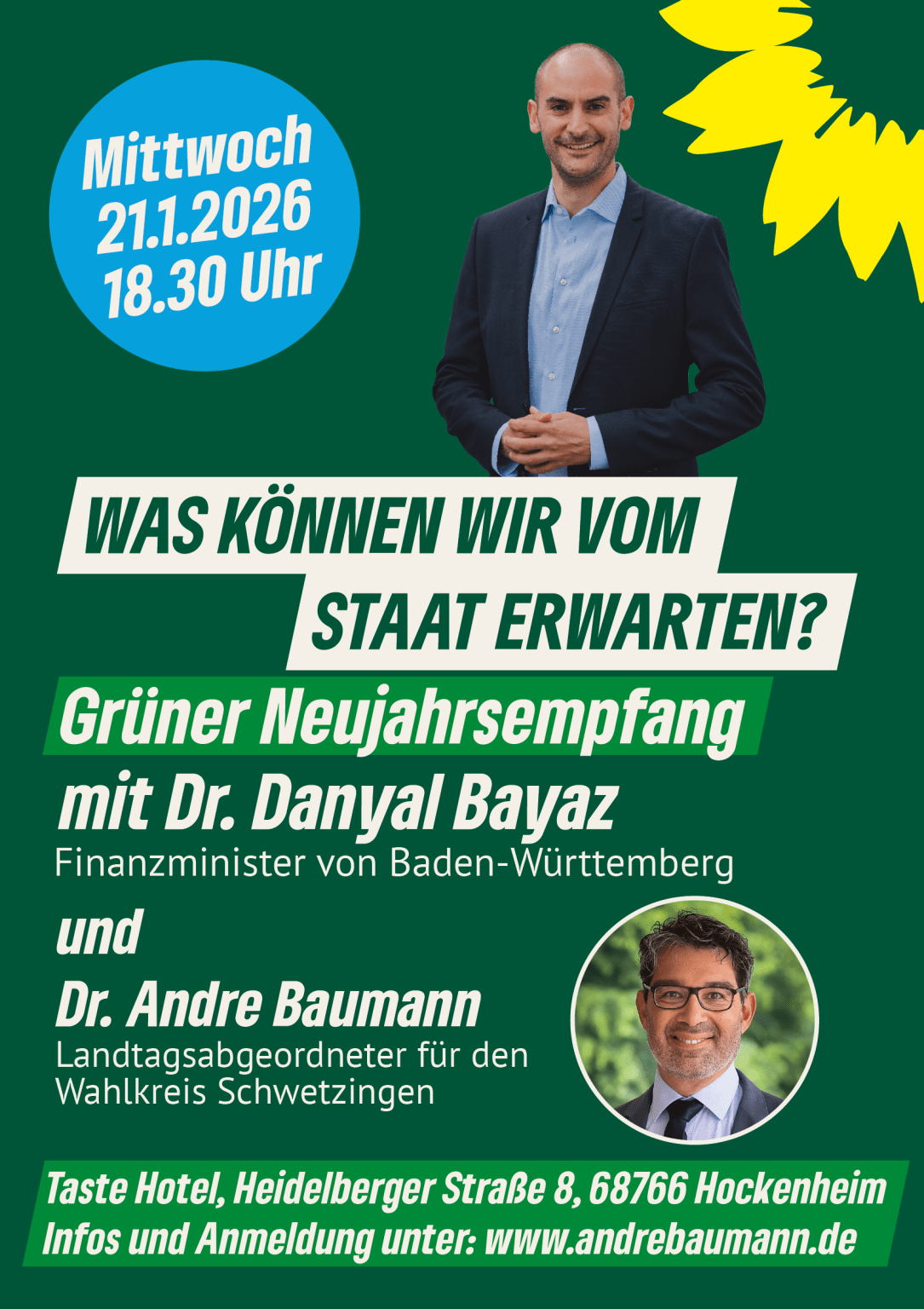 Der Grüne Kreisverband Kurpfalz-Hardt, der Landtagsabgeordnete Dr. Andre Baumann und der Ortsverband der Hockenheimer Grünen laden ein zu einem gemeinsamen Grünen Neujahrsempfang 2026.